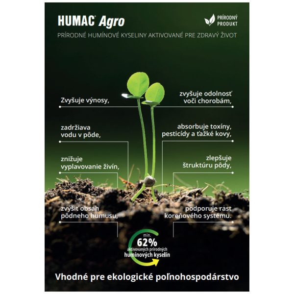 - 100% prírodný produkt HUMAC® Agro je ideálnym prostriedkom nielen na regeneráciu a stimuláciu pôdy, ale aj na zvýšenie produkcie biomasy. Preparát obsahuje viac ako 62% humínových kyselín, a preto je ľahko aplikovateľný a vysoko efektívny.