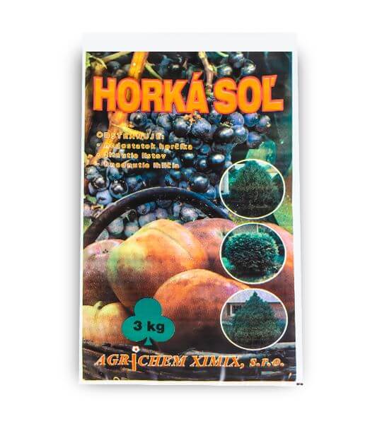 Použitie: Horká soľ – hnojivo na konifery, okrasné kry, vinič a ovocné stromy. Zabraňuje žltnutiu listov a hnednutiu ihličia.
