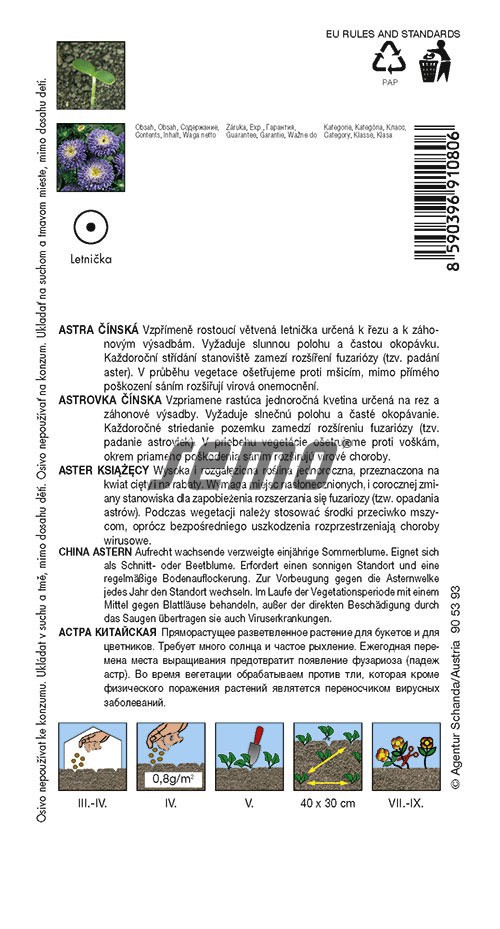 Vzpriamene rastúca vetvená letnička určená predovšetkým k rezu a k záhonovým výsadbám. Listy sú vajcovité, zubaté. Vyžaduje slnečné stanovište. Nedoporučuje sa priame organické hnojenie. Každoročné striedanie stanovišťa zabráni rozšíreniu fuzariózy ( padanie Astier ). V priebehu vegetácie ošetrujeme proti moliciam.